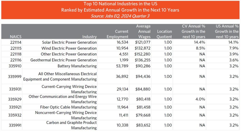 And finally, this table displays the top 10 national industries with the highest predicted national employment growth in the next 10 years. In this graph, current employment and wages represent National data, not data for the Coachella Valley.