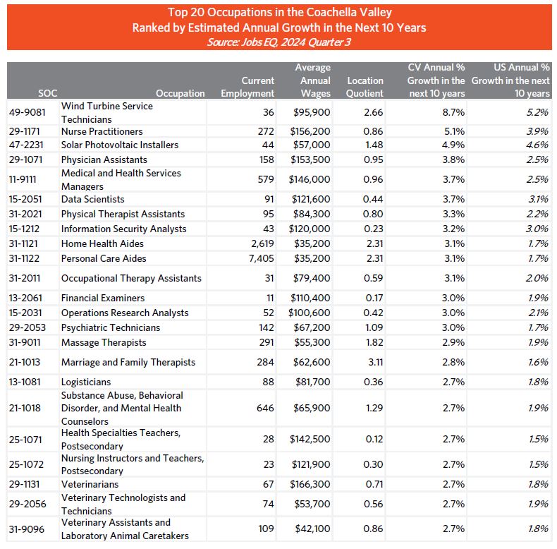 This table describes the Coachella Valley details of the top 20 fastest-growing jobs. As of Quarter 3, 2024, the Top 20 in the CV amounts to 5,028 jobs or 2.9% of the total workforce, with average annual wages of $70,325, well above the $52,971 of all jobs in the Valley. Estimated growth for all 20 occupations is expected to be higher than the national average. Location Quotients above 1 mean that these jobs have a higher concentration than the national average.